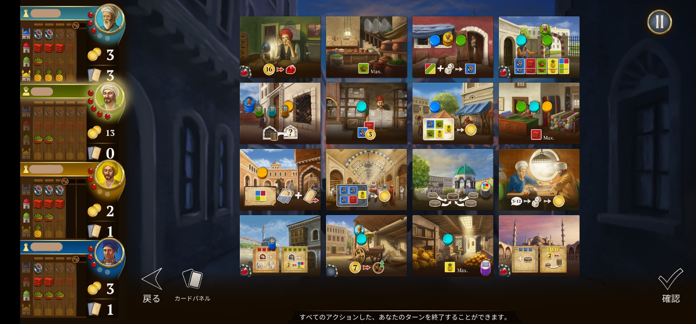 イスタンブール特有の「移動先に助手を置くか回収することでアクションができる」という仕組みがとても秀逸で、助手の残量や配置、回収ルート等、常に何手か先まで考えながらプレイせねばならずとても悩ましいです。「目の前の場所に行きたいのに助手駒不足で行けない!」というもどかしさや、効率よい配置回収ループを見つけたときの快感はイスタンブールならではだと思います。