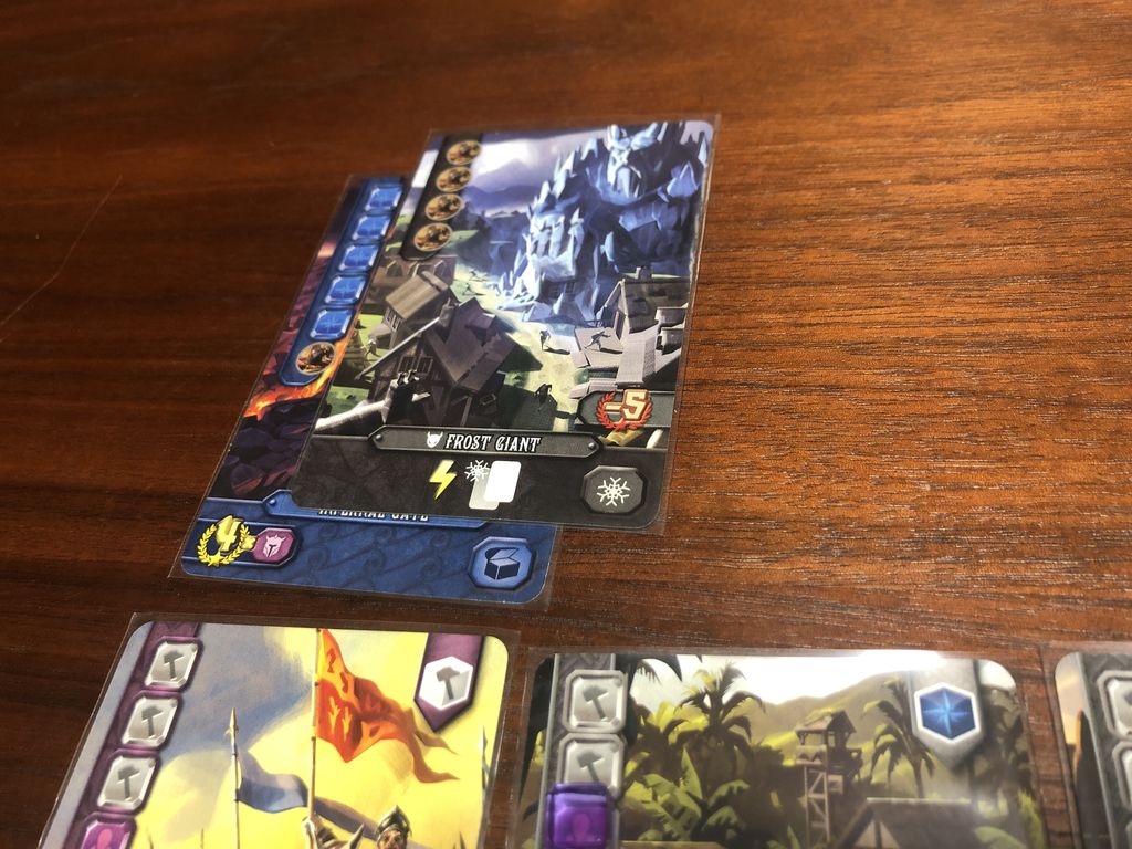 肝心の手札ドラフトは、2カ所に2枚つづ山札から引いていき、一方を選択。選択しなかったほうに災厄山から1枚裏向きに追加。裏向きなので良いカードなのか、お荷物カードなのかがわからないと言うジレンマを堪能。ソロでは1ラウンドに2回スパイを使用することで裏向きカードを表に返すことができるため、脅威は自分である程度の調整をすることが出来るようになっています。ソロであれば厄災を避けられますが、何処かのタイミングで勝負掛けないと得点が上がり辛い。その後も山札から2枚補充し、再度選択。これを4回繰り返し行うことで1ラウンドの準備が完了します。そして開発、状況に応じて討伐などを進めていきます。4ラウンドをすすめ最終目的を達成していれば勝利となります。