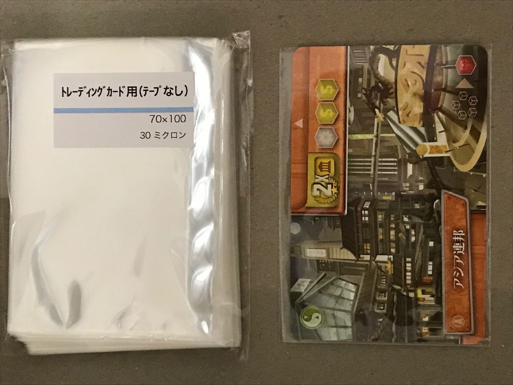 写真はアマゾンで購入した激安スリーブ。ほぼ1枚1円です。縦は完全にぴったり。横は3mmほど余っています。厚さ30μmで、一般のスリーブよりはかなり薄め。薄いことにより底部付近にわずかにしわは認められますが、細かい事は気にしない自分的にはokでした。