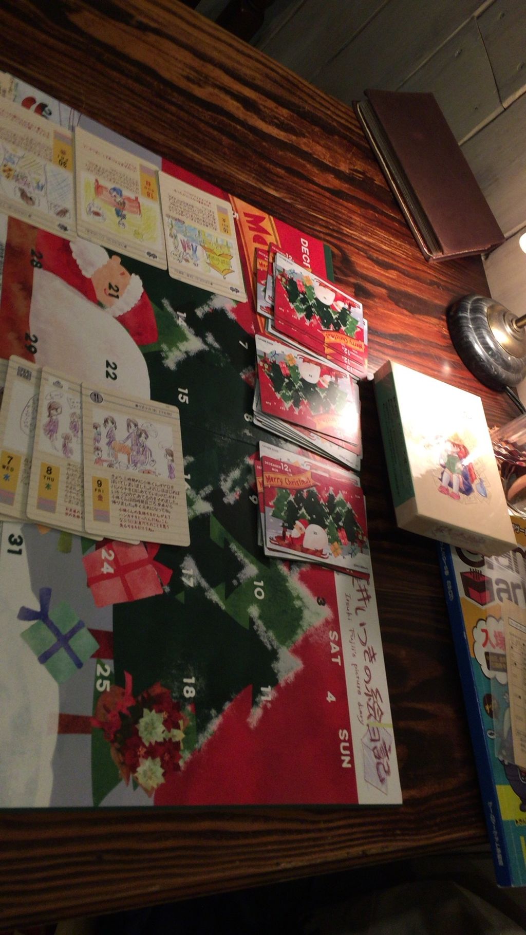 ●ゲームの開始:先番が目を開きスタート。最初、1月10日の位置にあるカードをめくり、例えばそれが12月5日の日記であればカレンダーの5日の位置に置き、そこにあるカードをめくり、例えばそれが12月25日ならそこに置きます。そういった感じでだんだん開きながらカレンダーが表に出てきますが、11月や1月のカードはマイナスになるので、やめ時が肝心です。