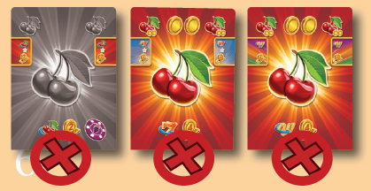 左のカードがモノクロ 左端のカードがモノクロで描かれている場合。シンボルは得点化できず、他のカードに関係なく、何も得られません。 |