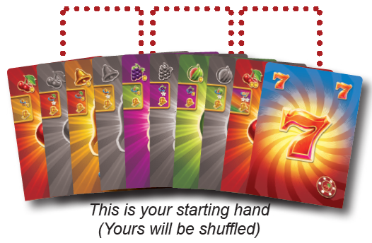 プレイヤーは時計回りの順番にターンを行い、手札から隣接する3枚のカードを自分のスロットマシンにプレイします。ゲーム全体を通して、プレイヤーはコインを使って既存のカードをアップグレードしたり、既存のカードをコミュニティマーケットの派手なカードに交換したりして、自分のスロットマシンを改善します。