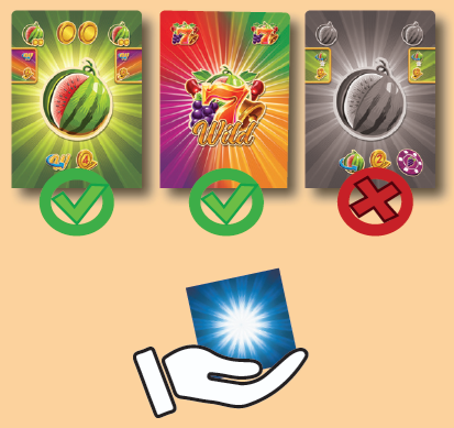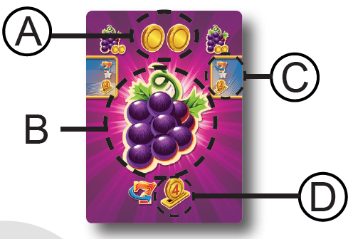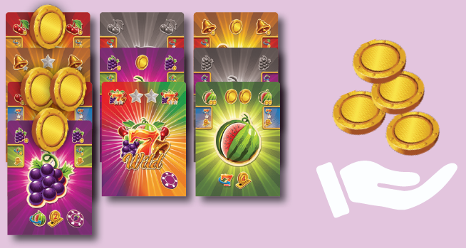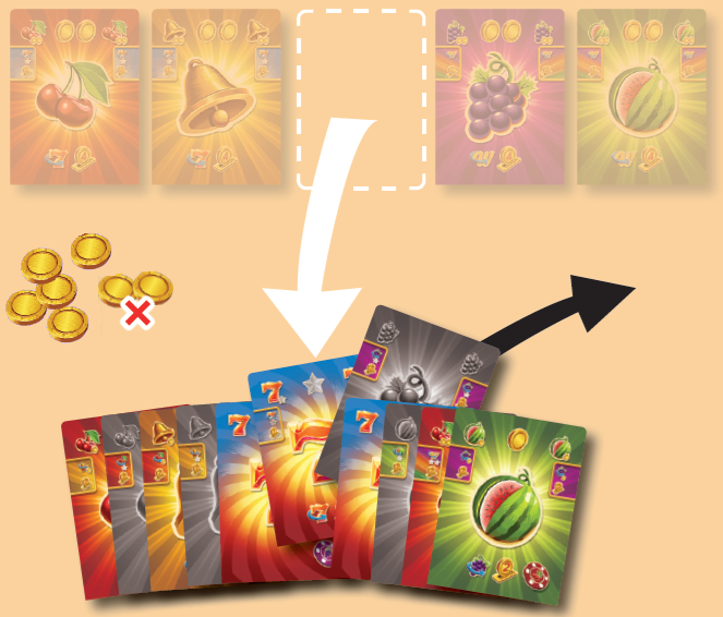 例: このプレイヤーは、7コインを支払って見えているセブンのカードを購入しています。 プレイヤーは、非アクティブなブドウカードを新しいカードに置き換えます。非アクティブなブドウカードはゲームから除外されます。 このプレイヤーは、新しいセブンカードをアクションの一部として使用できるようになり、その結果、3ゾロ目を出すことができます。 |