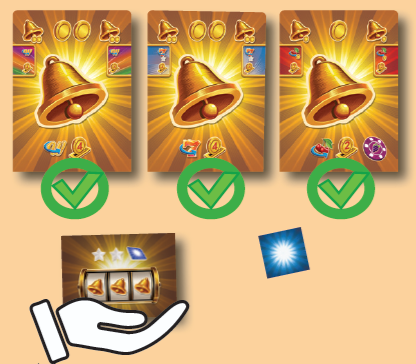 3 シンボル 出目に同じシンボルが3つ揃った場合、対応するスタックから一番上の目標カード1枚(星が最も多いカード)が報酬として与えられます。 |