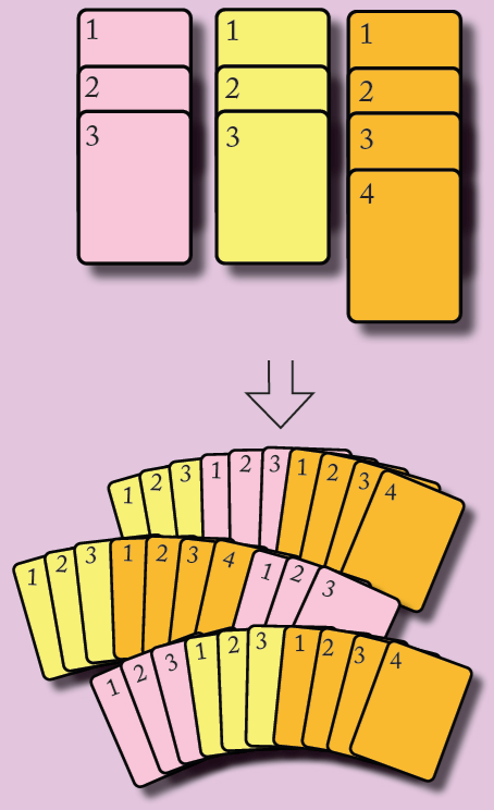 各プレイヤーは、プレイヤーごとに色分けされたほぼ同じカードデッキから始めます。プレイヤーは手札にある10枚のカードすべてを見ることにできます。プレイヤーは手札のカードを並べ替えることはできません。