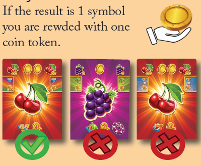 1シンボル 出目が1シンボル(左端と中央のシンボルが異なる、右端は関係ありません)の場合、1コイントークンの報酬を獲得します。 |