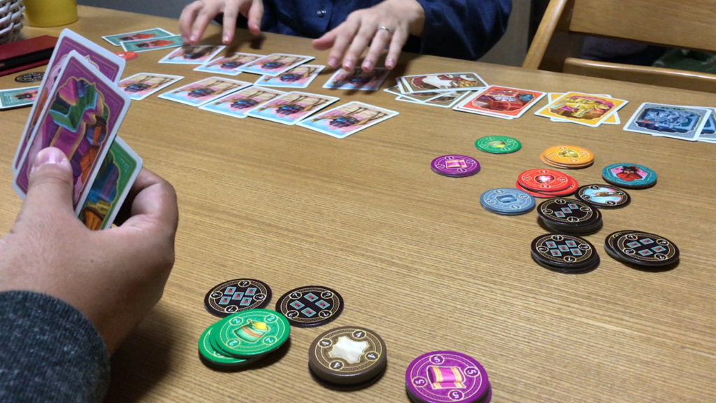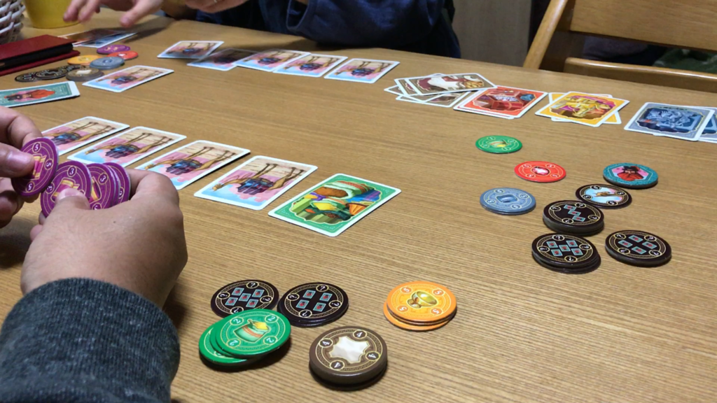 そんなこんなで、相手の回収効率を悪化させつつ、自分のは効率的に回収。売った分だけ品物トークン(丸いやつ)を得ていきます。
