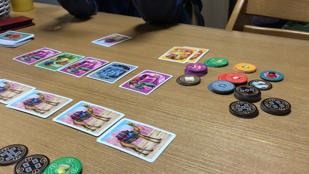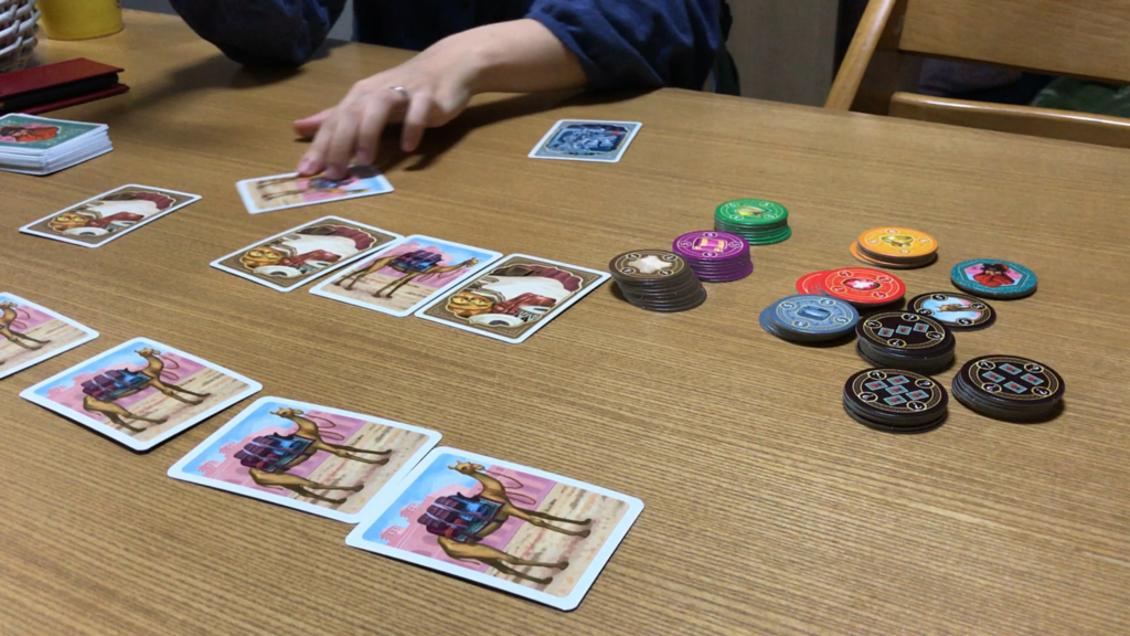 ラクダは手札にカウントされず、自分の家畜として脇に置いておくことができます。回収したあとを考えると、上述②の通り、品物カードと差し替えることができて便利です。しかし、そもそも上述③にある通り、ラクダを集める=市場が刷新される=刷新直後の手番は相手プレイヤー。となります。