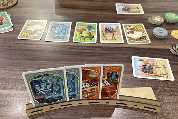 6種類の商品とラクダカードがあり、市場からカードを取っては、その商品を売却する。