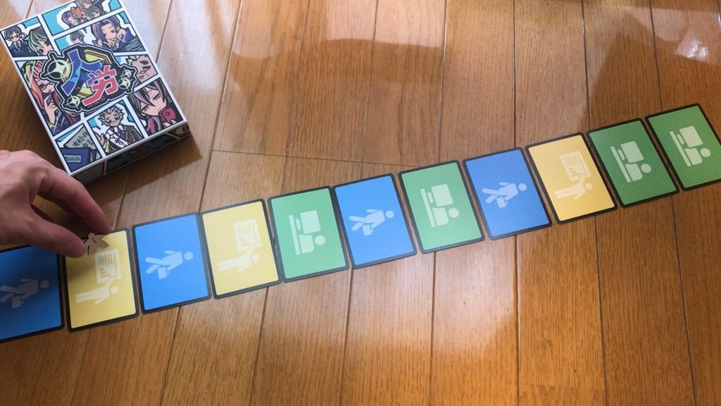 どちらかの端のカードをスタート、反対の端をゴールとします。同じ色のマスが3枚連続しないように調整してください。