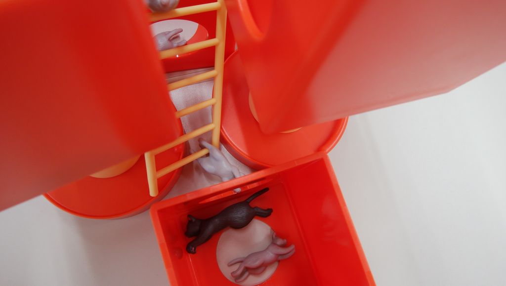 4種類遊べるゲームの中から「飛び込め!キャットタワー」を選択。くみ上げたキャットタワーへ早くたくさんのネコを乗せたり放り込んだりしあった後、ネコの種類や乗り方で得点計算。得点の多い方が勝ち。