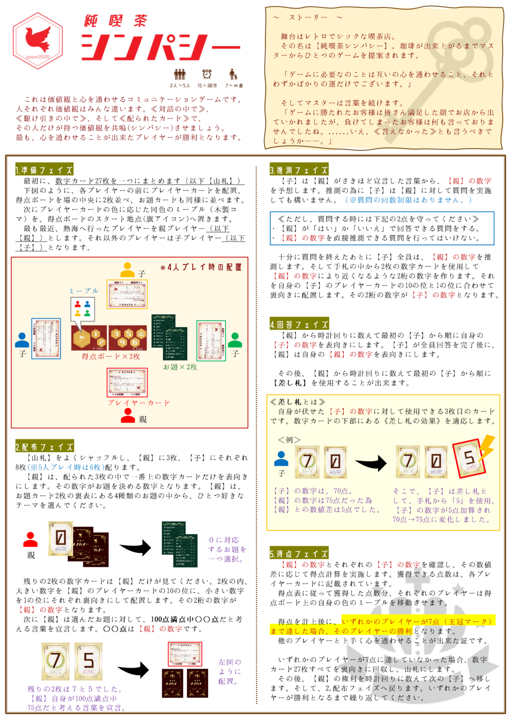 レビュー純喫茶シンパシー<概要>価値観と心を通わせるコミュニケーションゲームになります。それぞ...5年以上前の投稿