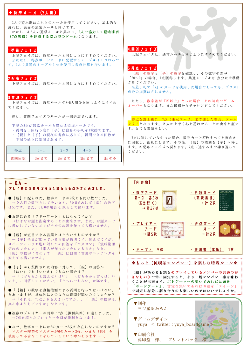 ルール/インストああ、1文字足りな本作の遊び方についての説明書となります。オモテ面とウラ面で、2ページの...2年弱前の投稿