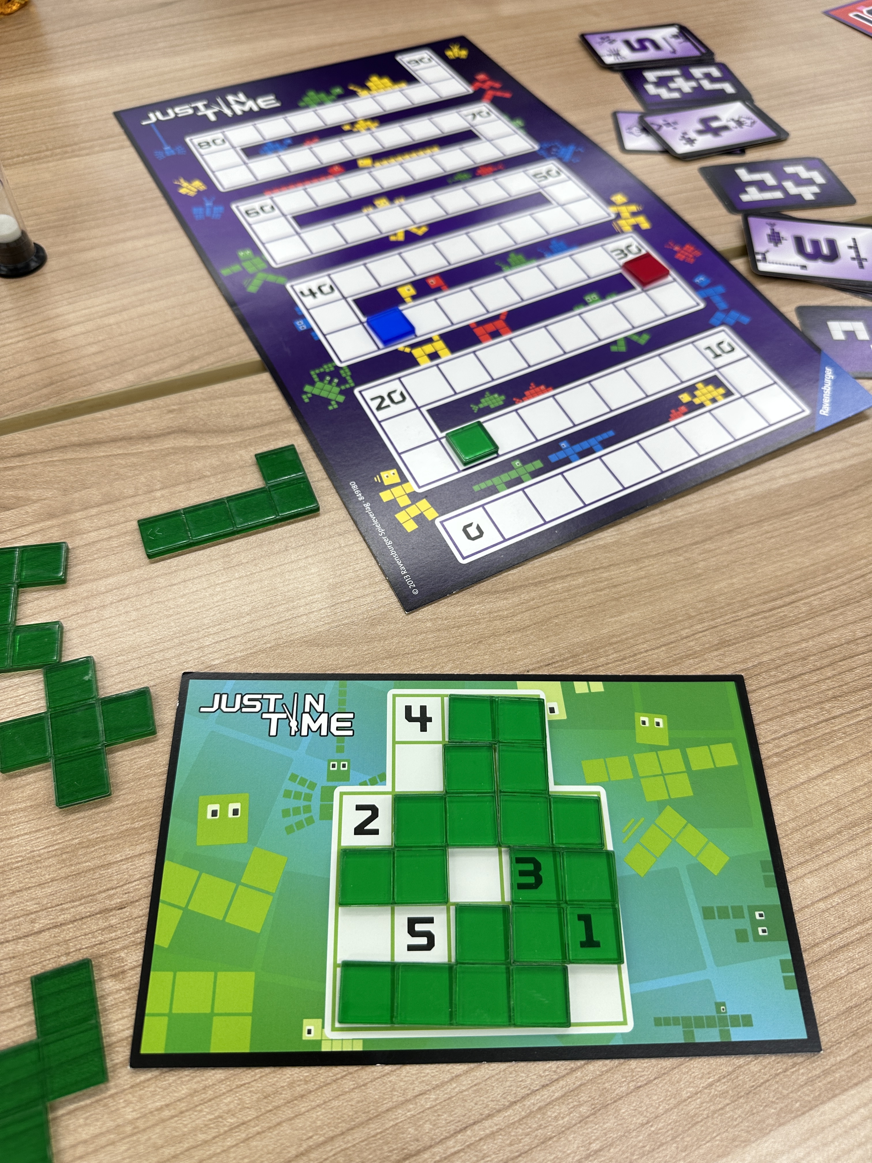点数は、お題カード(パズルの台紙)に所々数字があるので、それを「潰さないように」ピースを配置して得点を稼ぎます。