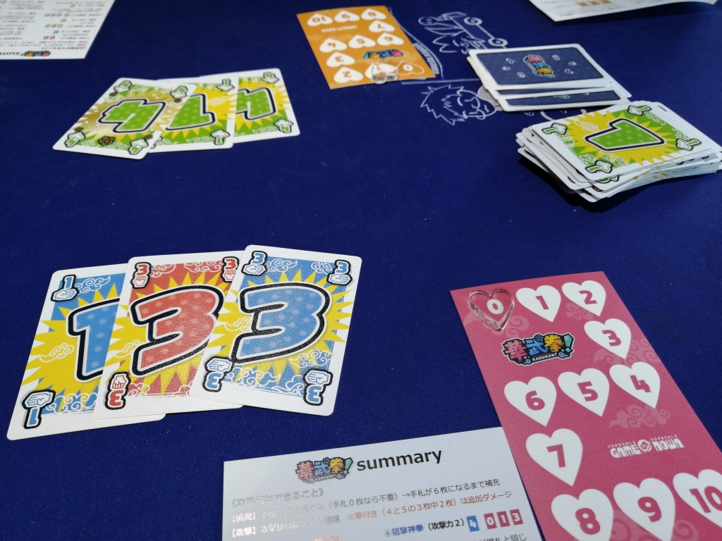 3色各3枚の0〜5の数字カードを使用し、4〜5のカードは2枚ずつは華アイコン付き。