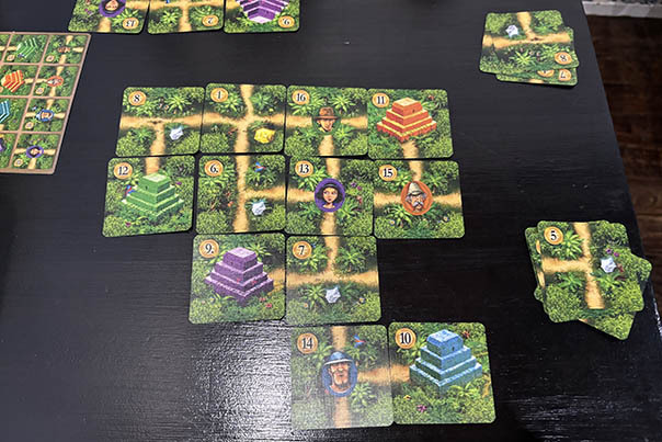 16枚のタイルを2枚ずつ出して並べていき、冒険者から神殿に繋がった数やその途中にある水晶などが得点になる。