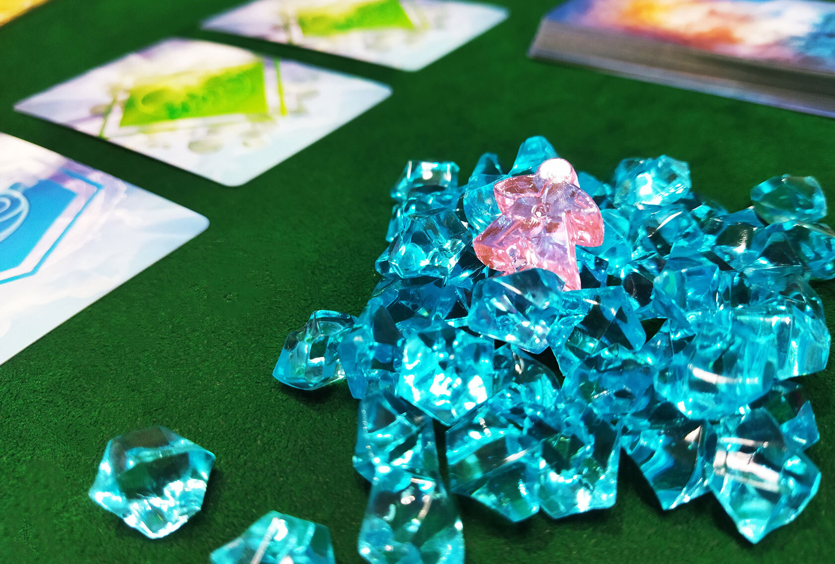 なんかすごい物質で時空旅行。がテーマの輪ゴム陣取り。マップにストーリーのあるゲームなのでみんなで読みながら楽しく場所を取り合おう。先に取ったらあとの人からカードを貰えるよ。コマもキラキラしててキレイ。