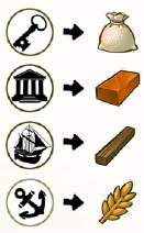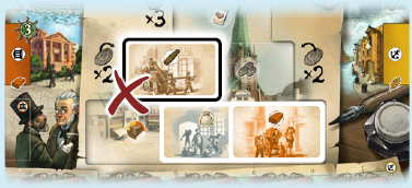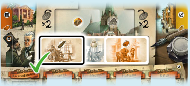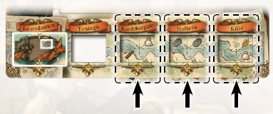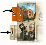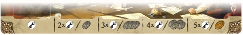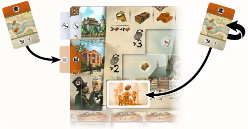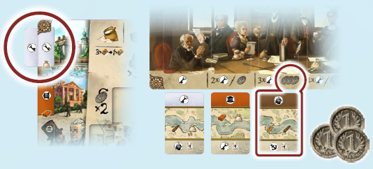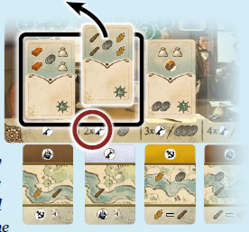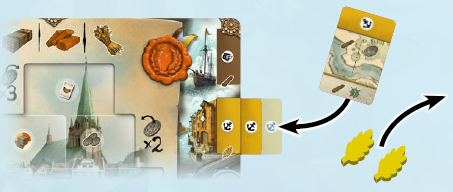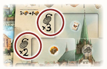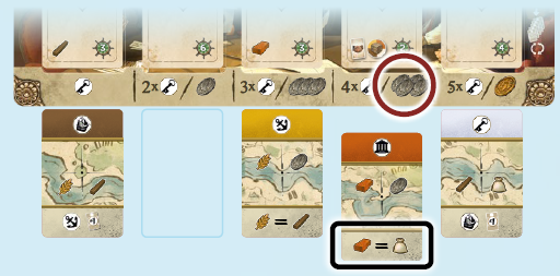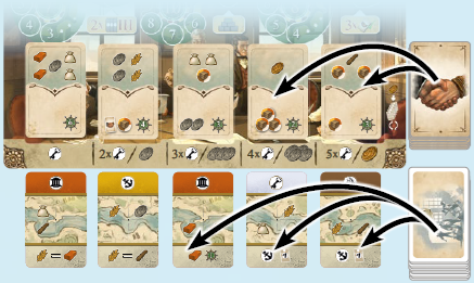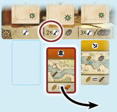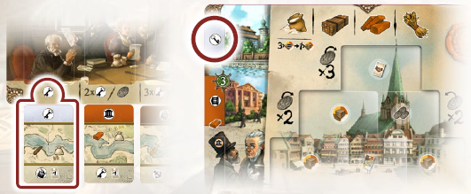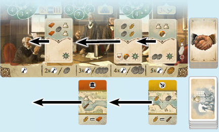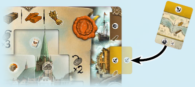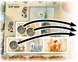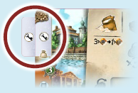 空きスペースに商人を配置する場合、ただちにそのスペースに描かれたボーナスを受け取ります。このボーナスは一度だけ利用できます。配置した後は、既存の商人に重ねて新しい商人を配置した場合でも、それらの下にあるボーナスを再び受け取ることはできません。