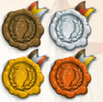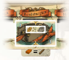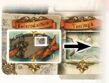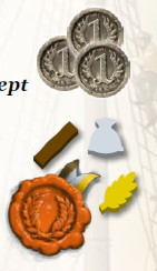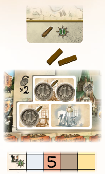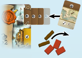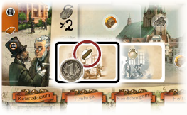 3コインと商品3つ 最後に、1ターラーコイン3枚と、自分のプレイヤー色以外の各色の商品1つを取ります。それらを個人サプライに置きます。プレイヤーボードの封蝋のリボンは、どの商品を受け取るべきかを示しています。 |