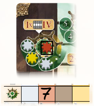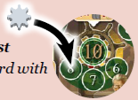 2人用ゲームの場合は、評議会ボードの各スコアリングホイールで2番目に高い数字を、未使用の色のスコアリングチップで覆います。 |