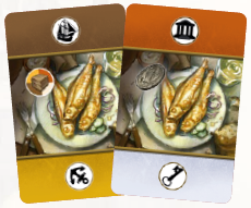 6) 96枚のアクションカードの裏面には、さまざまな商品が描かれています。これらのカードをすべてシャッフルし、評議会ボードの右側に裏向きの山にして置きます。次に、山から5枚のカードをボードの下のスペースに表向きに配ります。
