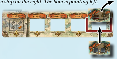 5隻の船 プレイヤーボードの図のように、番号1の船を運河に置きます。 残りの4隻の船はとりあえずボードの脇に置きます。 |