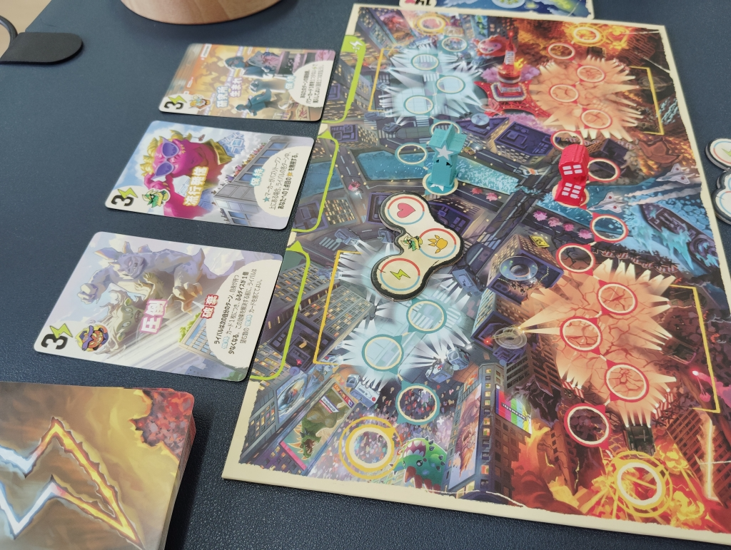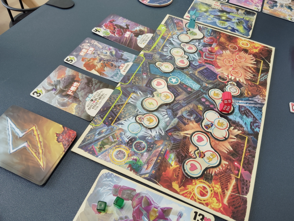 カード購入時にアイコンがあると共通ボードにタイルを配置でき、コマが踏む度に攻撃したり体力が回復したり、追加ダイスの獲得ができたり駒の移動での争いも激しくなります。