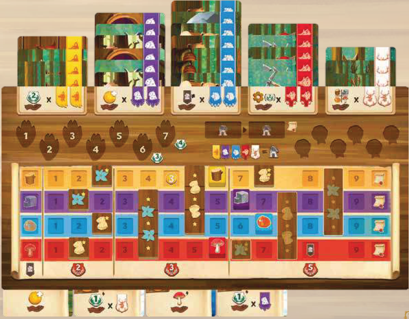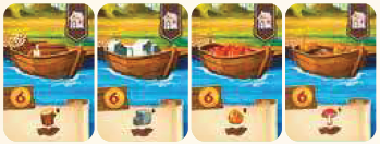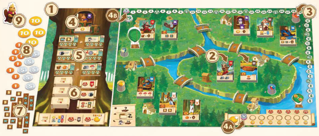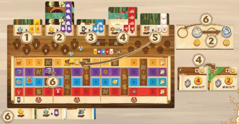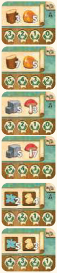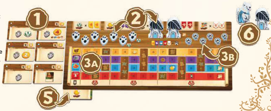 彼らは、プレイヤーボードと、対応する色のコンポーネント(ワーカー1つ、家3つ、足マーカー7つ、橋目標マーカー6つ、投資マーカー1つ、スコアマーカー1つ)を取ります。また、ホームカード1枚、アクションタイル6枚(両面)、資源マーカー4つ(木、石、樹液、食料)のセットも取ります。