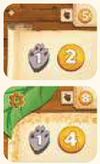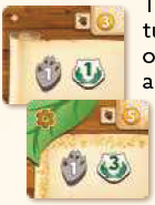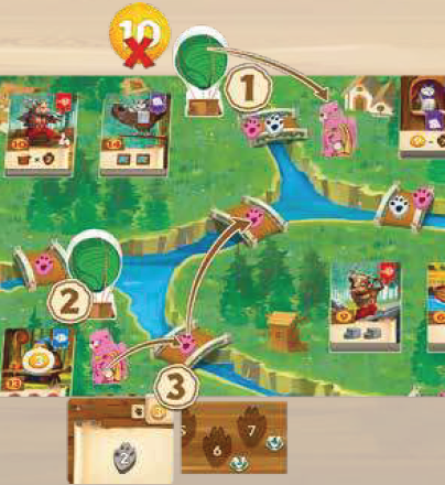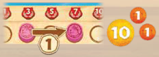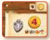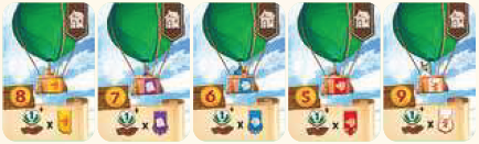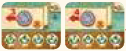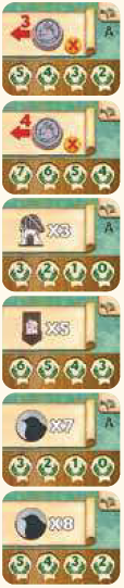 これらはゲームの重要なメカニズムです:あなたのターンで、利用可能な(まだプレイヤーボードの左側にある)アクションタイルの1つを選択する必要があり、休憩してコインを獲得する(右上隅の効果)か、このラウンドでまだ渡っていない橋を指定された数だけ渡るか(右下の効果)をします。後者の場合は、立ち寄った地域からキャラクターを雇う(または建造物を使用する)ことができる必要があり、そのキャラクターからボーナスを獲得できます。