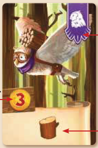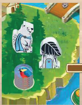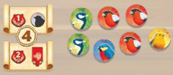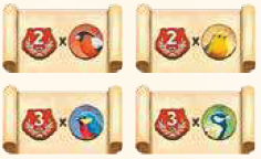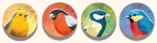 鳥には4種類あり、それぞれがメインボードの地域の1つに生息しています。各ラウンドの開始時に、各地域のカード(キャラクターまたは建造物)に1つの鳥トークンが表向きに配置されるため、早くにカードを選んだプレイヤーはそのボーナスも獲得し、鳥の助けを受けることができます。 |