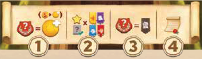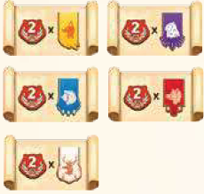 4枚の開始カードを取り、メインボードの横に(ランダムな面を上にして)プレイヤーの数だけ配置します。未使用の開始カードを箱に戻します。次に、プレイヤーの数と同じ数の女王の好意を(すでにセットアップされている山から)公開し、各開始カードの下に1つずつ配置して、開始カード+女王の好意のペアを形成します。