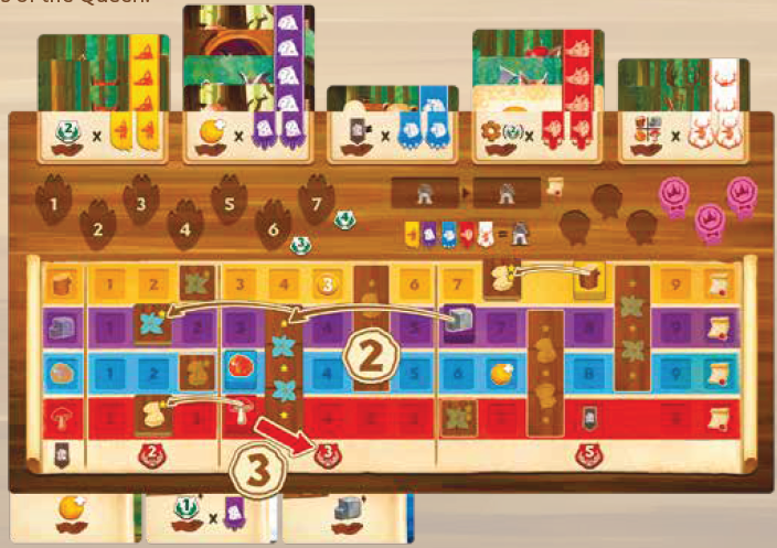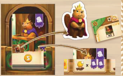ターンの逆順に、各プレイヤーはペアを1つ選択します: 自分のプレイヤーボードの隣に女王の好意を置き、開始カードで下記のことを行います: