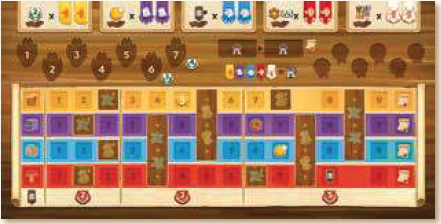 メインボードは4つの地域に分かれており、7つの橋で接続されています。各地域には、会えるキャラクターや使用できる建造物があります。プレイヤーのワーカーは、そのラウンド中にまだ渡っていない橋を渡って、ある地域から別の地域に移動します。移動を最適化することは、勝利への重要な道です! |