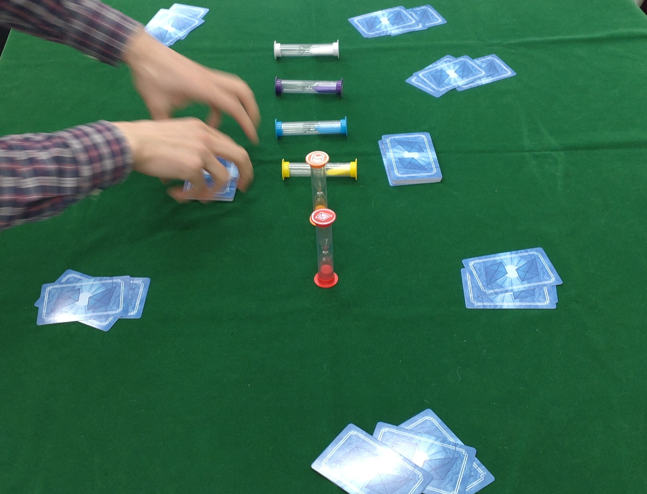 砂時計が落ちる前に、みんなで全てのカードを捨てるゲームです。