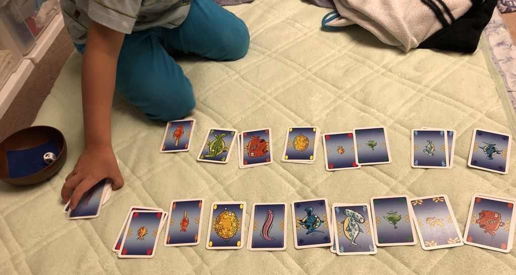 4歳児と2人でプレイした感想ですが、タコカードによる魚カードの奪い合いがシビアに熱いです。特に、うちの4歳児はタコダイスで「3」の目ばかり出すので、確実に3枚持って行かれます。