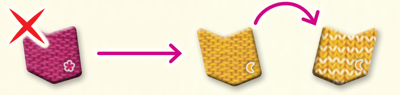 手持ちの毛糸タイルを1枚選び、アクティブな衣服(編針トークンが置かれ、空きスペースがある衣服)のスペースへ配置します。毛糸タイルは向きが一致するスペースのみ配置可能です。