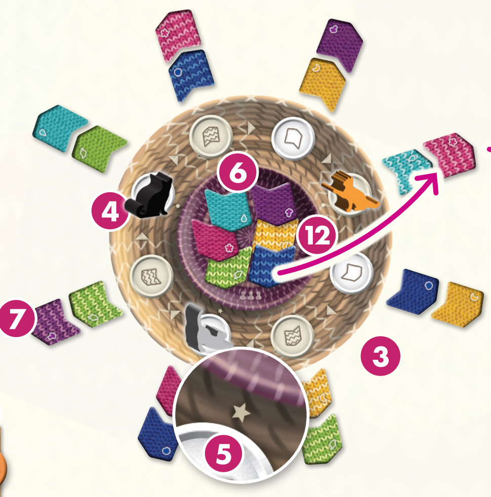 12, スタピマーカーを持つプレイヤーは、編み物サークルボードの中央にある6枚の毛糸タイルから1枚選び、編み物サークルボードの周囲にある毛糸タイルの任意のスロットに追加します。