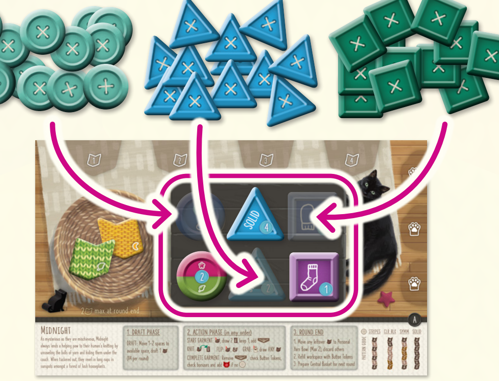 - 各プレイヤーは、個人ボード上の作業スペースを、対応するボタンの山札から新しいボタントークンで補充し、空いているスロットを埋めます。プレイヤーは各ラウンド開始時、作業スペースに常に6つのボタントークンを保持している必要があります。