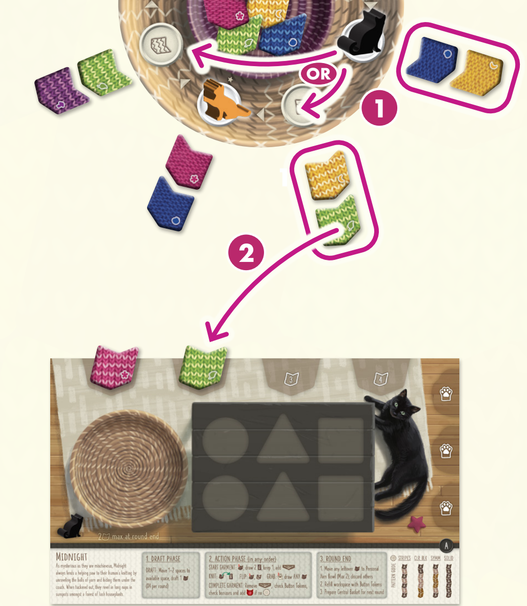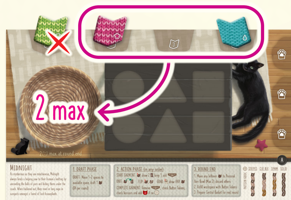 - 各プレイヤーは個人ボード上部のスロットに配置されていない毛糸タイルを、個人ボード上の個人用毛糸ボウルに移すことができます。ただし各プレイヤーは次のラウンドに向けて毛糸タイルをボウルに2枚までしか保持できません。2枚を超えるタイルは袋に戻します。