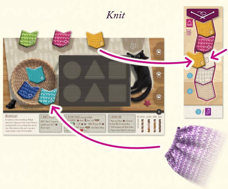 1, 毛糸準備フェーズの各ターンで、編み物サークルボードを時計回りに自分の猫駒を1マスか2マス進め、止まったマスに隣接している毛糸タイルをどちらか選んでとっていきます。(毛糸タイルがないマスには止まれません)