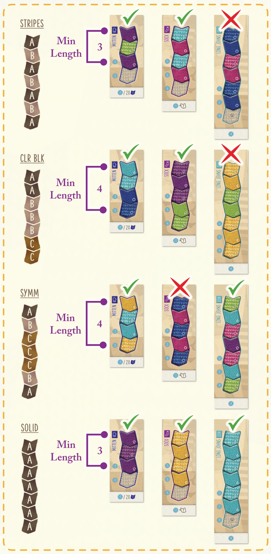 衣服を完成させる際、色の配置に基づいて、4種類のパターンのいずれかを作成しなければなりません。できなかった場合、その衣装には「お怒り猫トークン」が付与されてしまいます!