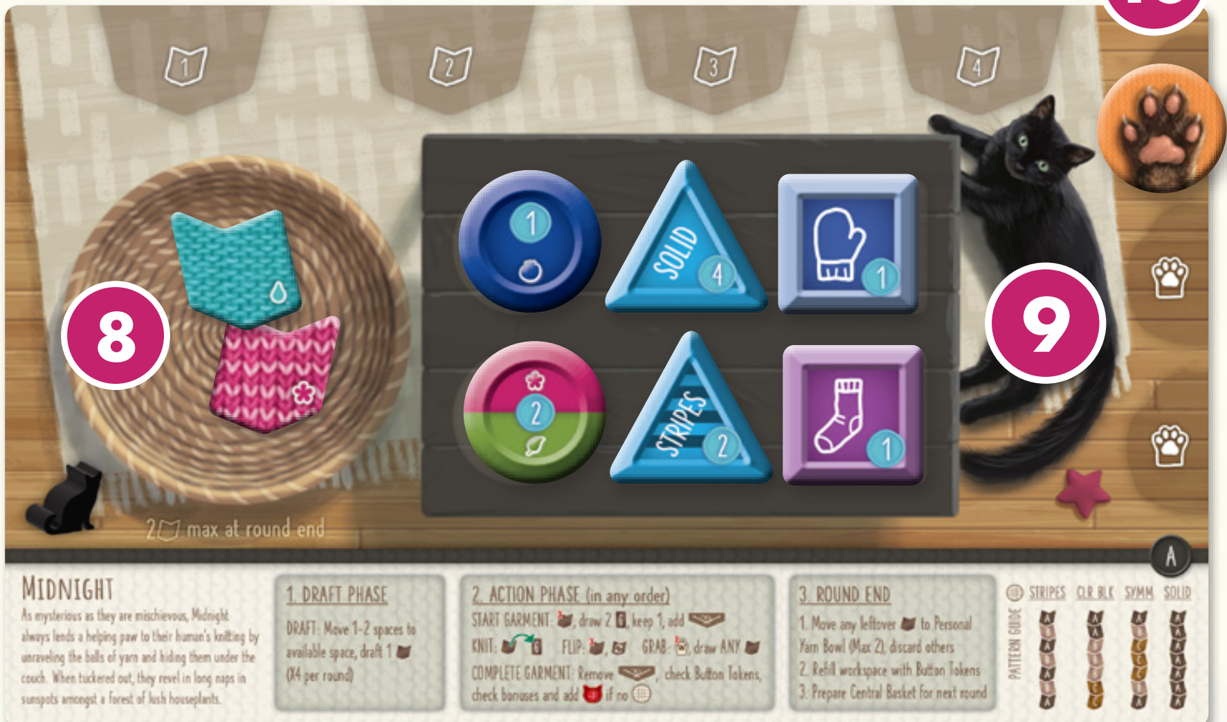ゲームは6ラウンドで進行し、各ラウンドのプレイは極めてシンプルです。まず「糸選びフェーズ」で中央のバスケットから糸を集め、次に「編み上げフェーズ」でそれを衣類に仕上げます。糸を選び衣類を編む際、配色と模様を完璧に組み合わせるよう最善を尽くしましょう!最終的に勝利点を最も多く獲得したプレイヤーが勝者となります。勝利点は様々な方法で獲得可能です。衣服を完成させること、特定の衣服条件を満たしボタンを付けること、そして新しい衣服ごとに追加されるボーナス得点条件を達成することです。その過程で、あなたの猫の相棒が、袋に手を伸ばして最高の毛糸を確保するお手伝いをしてくれます!