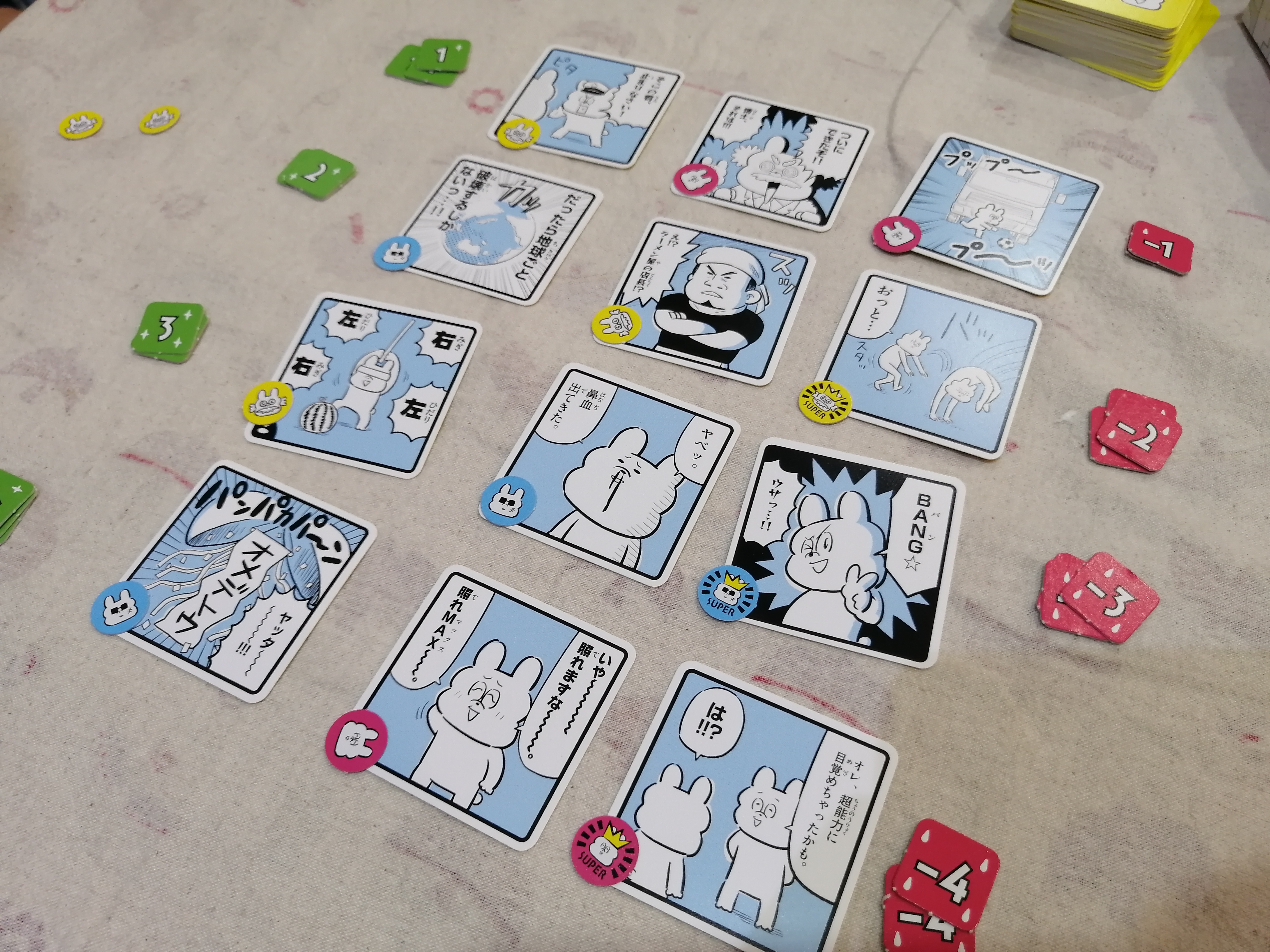あらかじめイラストやセリフが描かれているコマ割りカードを順番に並べていき4コマンガを作る。作品が出来上がれば読者はお気に入りと打ち切り作品を決めます。誰がどのカードを配置したかはチップで分かるようになっていて、お気に入りに選ばれたら得点獲得です。