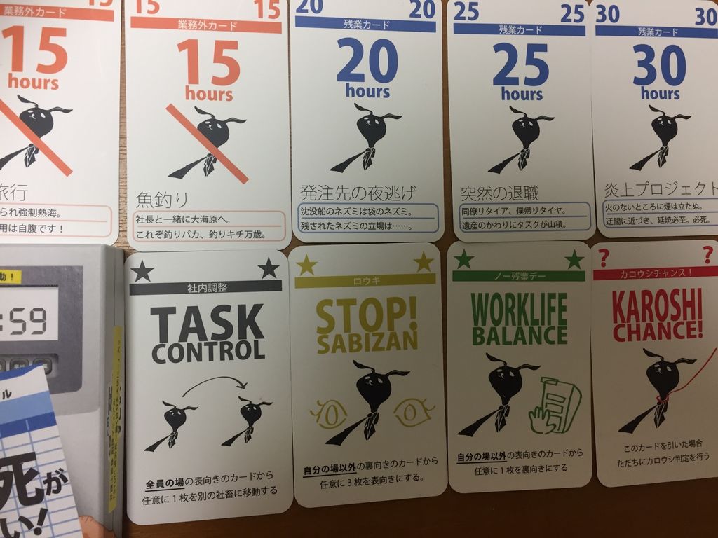 順番に手札3枚の中から2枚を場に出して、業務時間を増やしていき、一番働いた人が勝ちというゲーム!