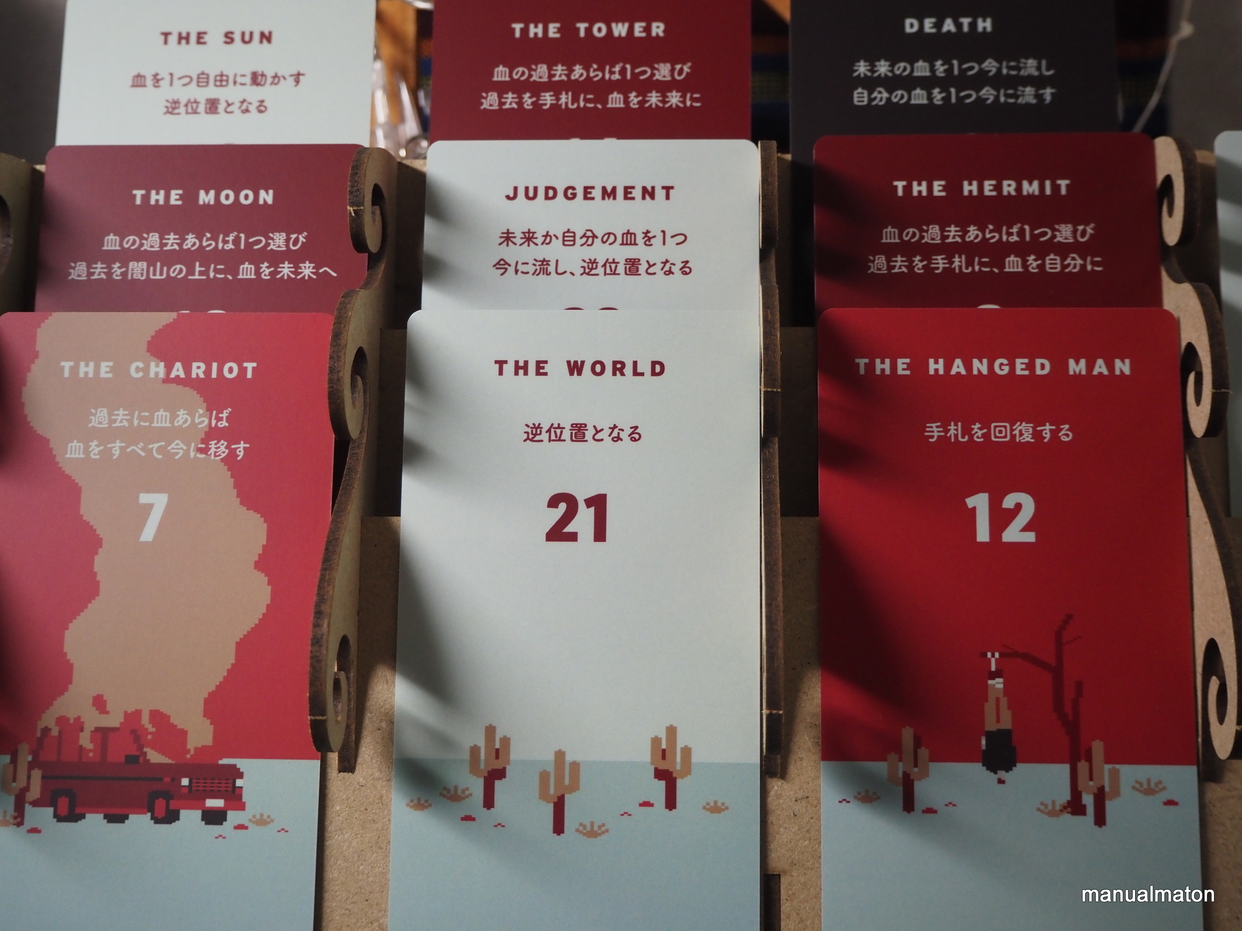 アルカナの番号の昇順(逆位置からの場合は降順)で出す縛りが思いのほかきつく、「血」と呼ばれるトークンの数によって手札が補充できる量も決まるのでシビアな手札管理を要します。
