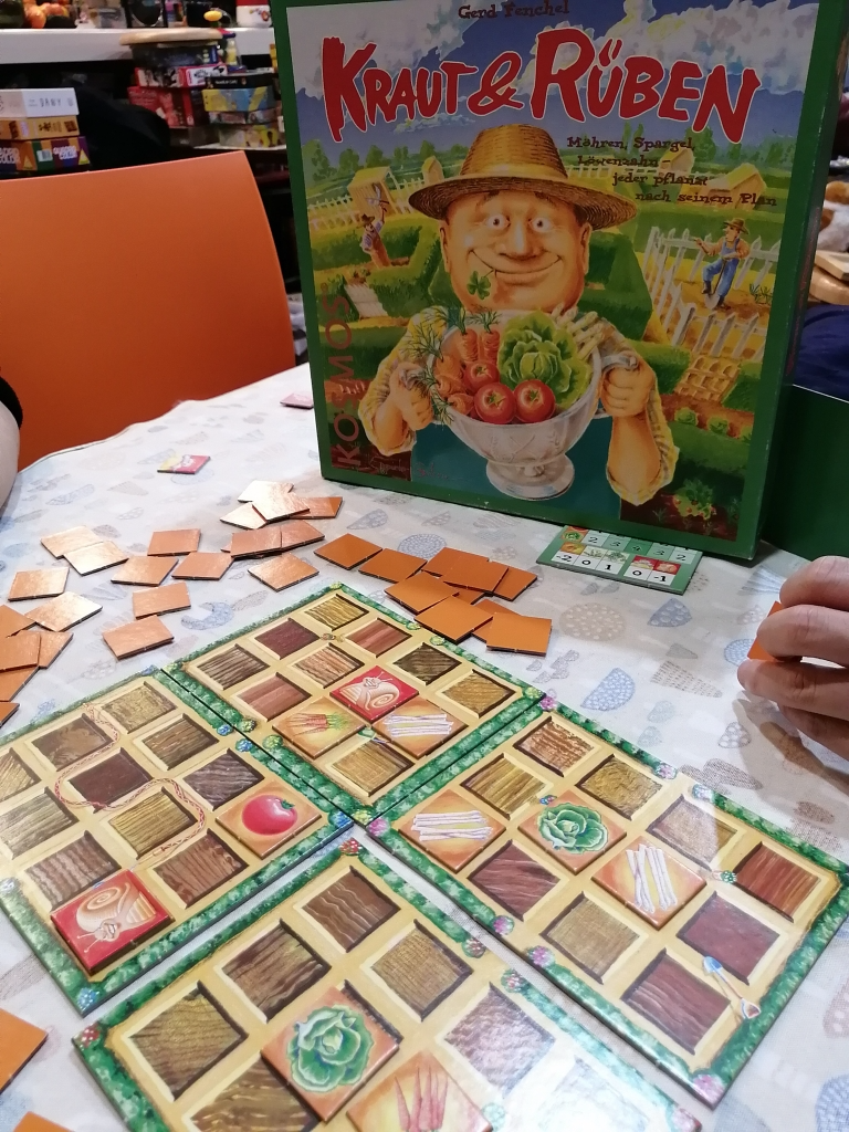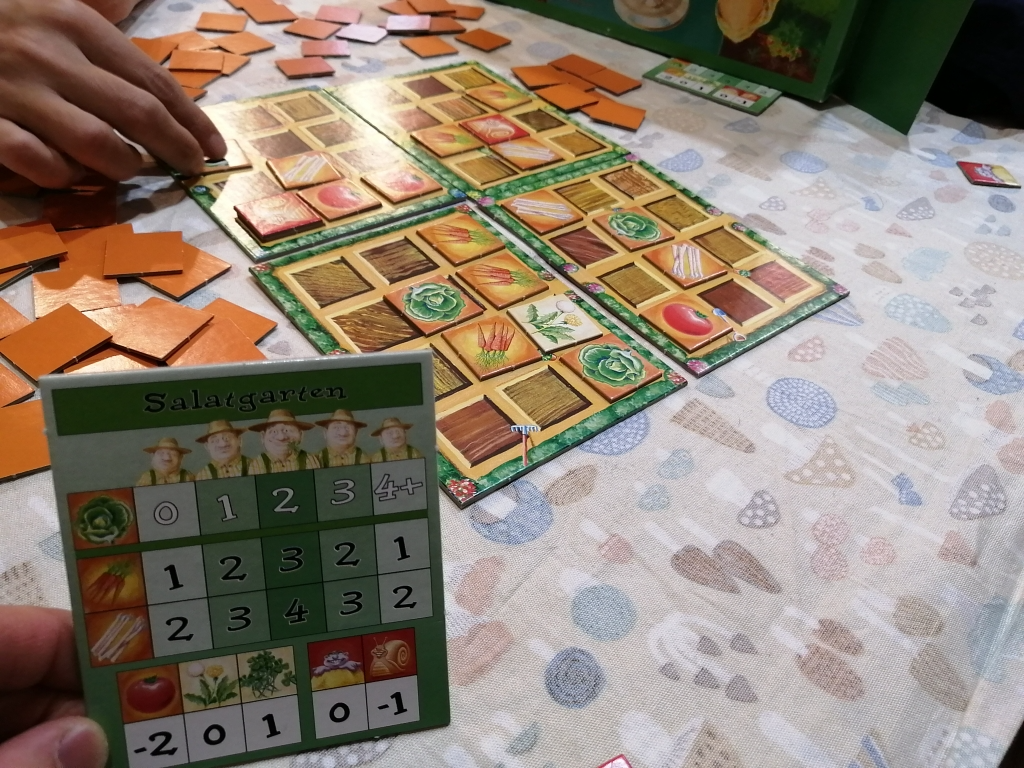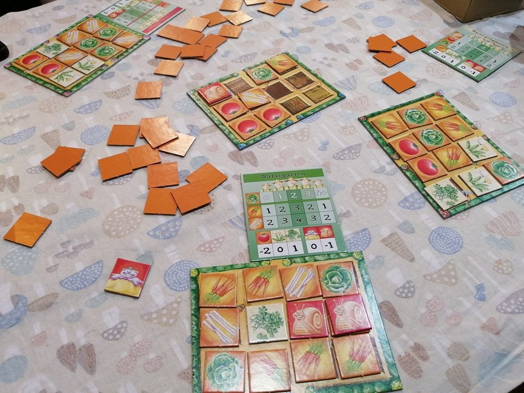 プレイヤー人数足す1枚のやさい畑に野菜やたんぽぽやもぐらを配置したりする。人によって配置したい野菜3種としたくない野菜1種とあり、配置数により得点が変化する。