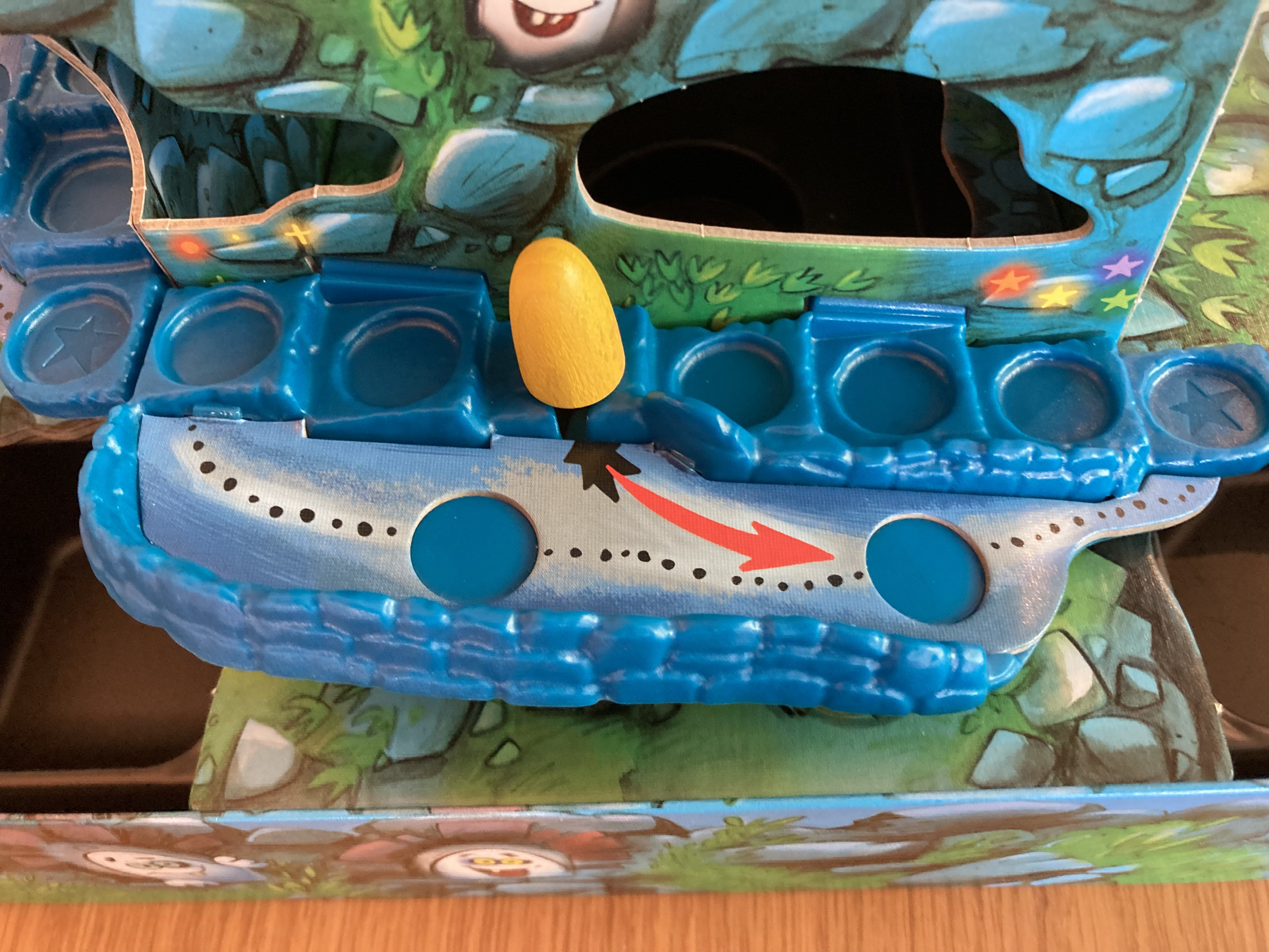 矢印の出目が出たら回転し、おばけコマに当たるとボールと同じ四隅の穴に落ちます。その後、自身の手番にダイスを振り穴の上にある星マークのマスにコマを移動する。
