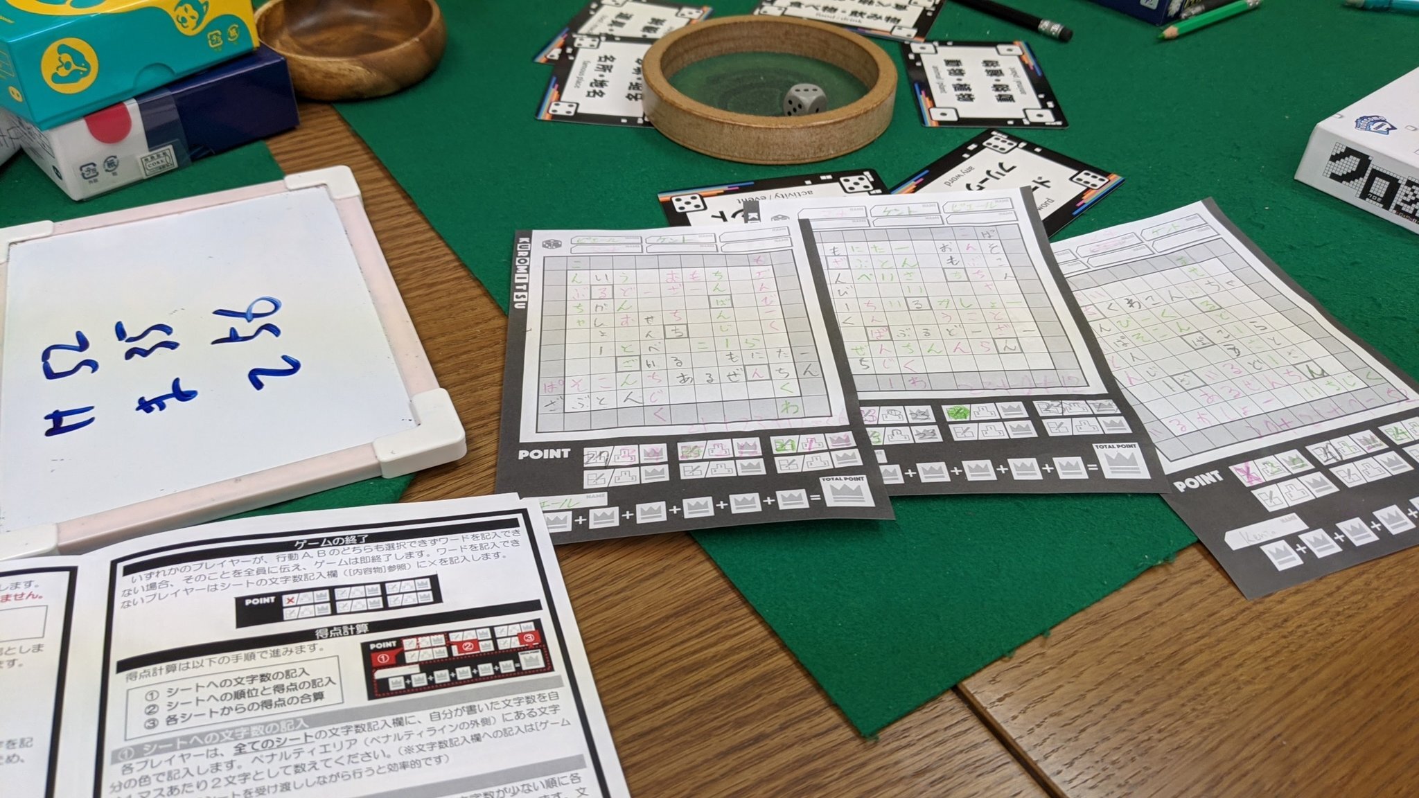 ・イメージとしてはシート内にどう埋めるかというよりは、ダイスで出たテーマから自分のシートに無駄なく書けるワードをいかに早く思いつけるか、という瞬発力の方を求められるゲームでした。なので得意な人/苦手な人は結構分かれるかもしれません。