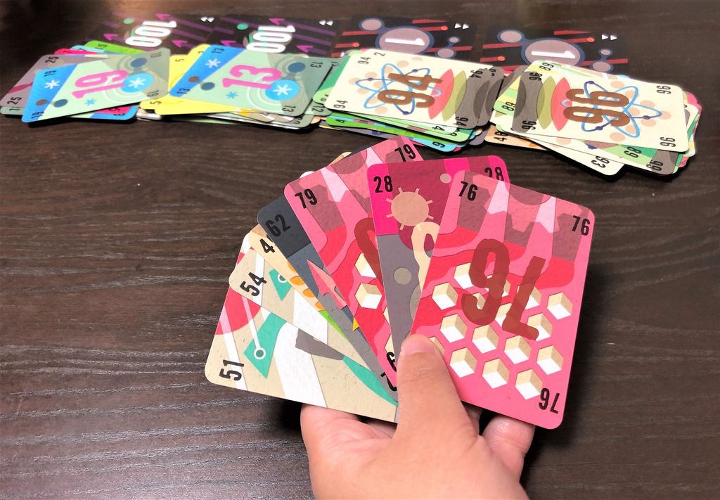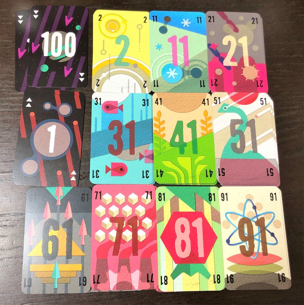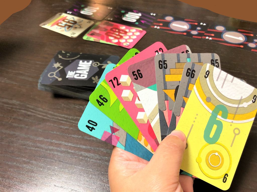 ザ・ゲームのゲーム部分は、違いは特にありません。オーソドックスな、いちばん基本のザ・ゲームです。4つの置き場があり、2つは100から降順、2つは1から昇順。ちょうど10違いのカードを持っていると、遡って置くことができる。ぜーんぶ置ききったら、完全勝利!