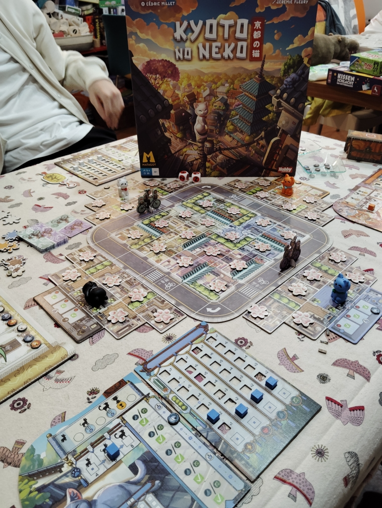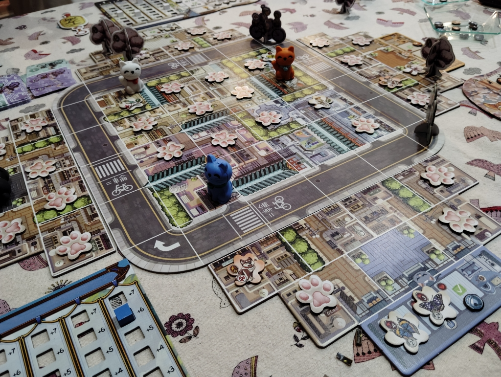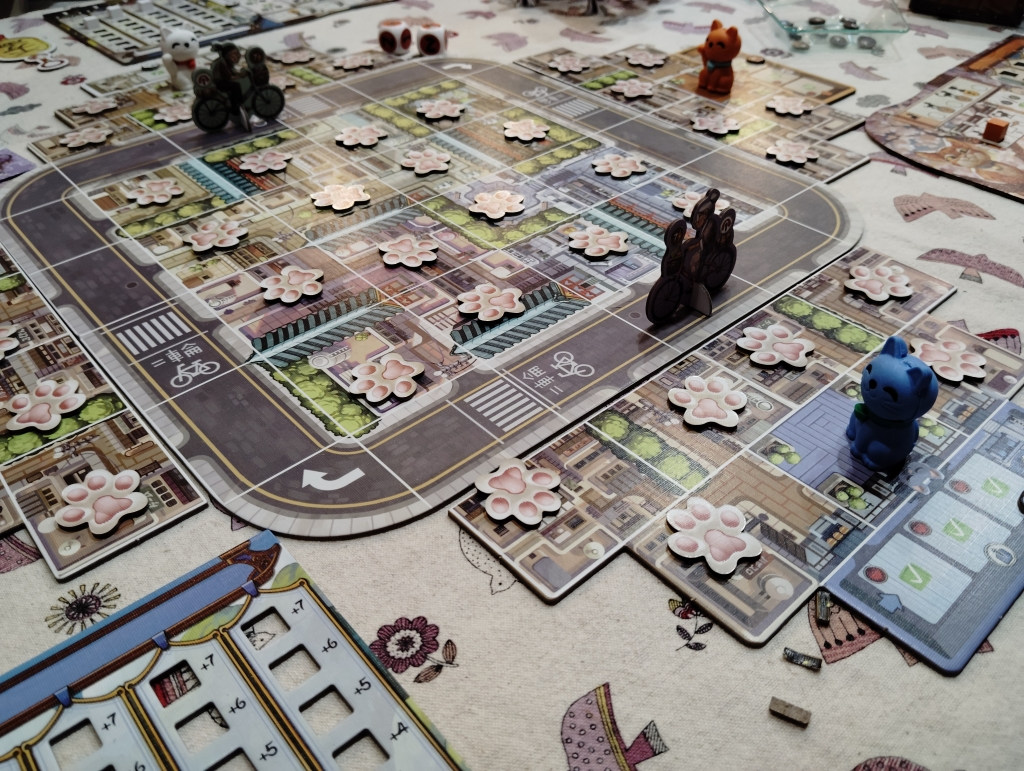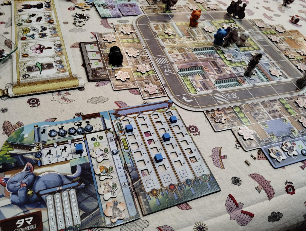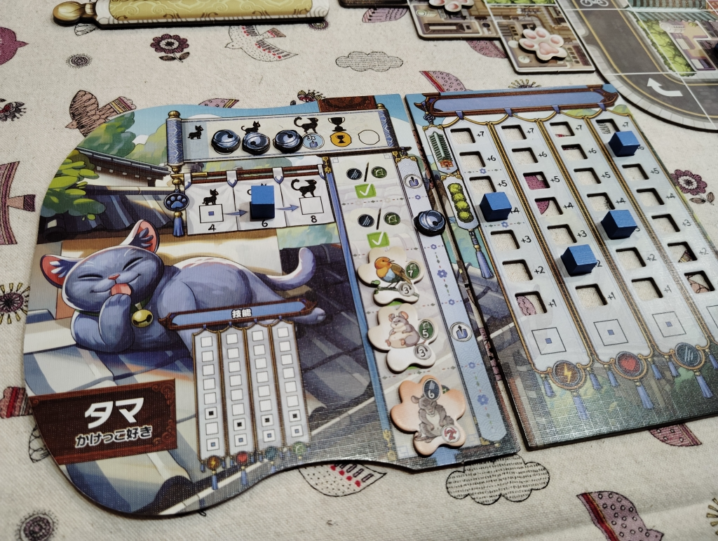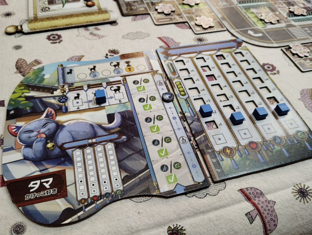 誰かが5点以上の目標を達成したら手番を一緒にしてゲームを終了するのと、誰かが2点と4点に到達した際には「他プレイヤーのネコも一緒に成長する」ので、パラメーターが上がりやすいからゲーム自体は30〜45分ぐらいのゲームで、ネコになってダイス判定を楽しむのがオススメです。